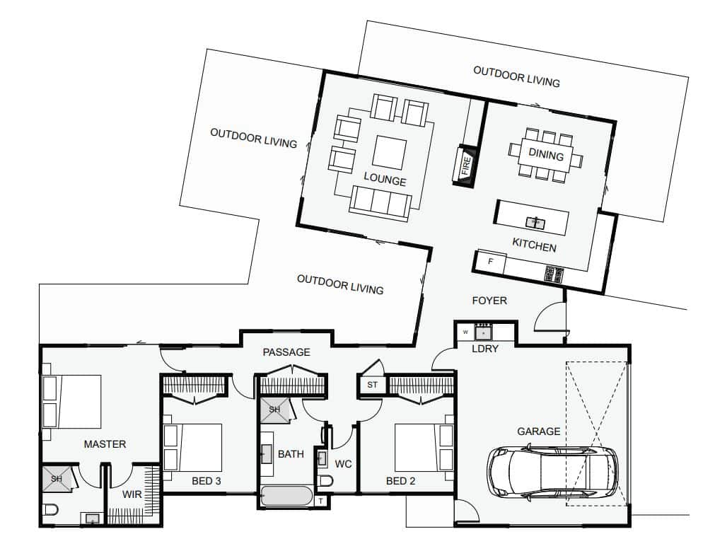 Two main wings provide the basic layout of this home. The bedroom wing is longer and provides the perfect shelter and privacy to the outdoor living and lawn space. By having the living wing set at an angle the kitchen and dining are positioned in the morning sun. The angle also gives a very sheltered outdoor living space between wings and a view angle from the lounge which reaches out into the property. This home could give your section the edge you're looking to create.