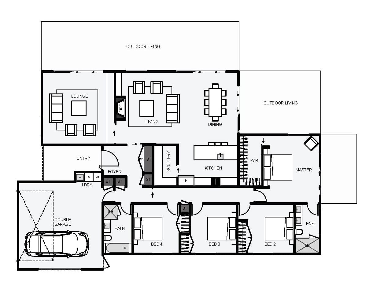 This home is designed to suit the modern home owner with its clean design lines and contrasting materials. The dual living can be closed off with the large slider, giving multiple living options. Storage is plentiful and is all located within close proximity from the laundry. Additional extras include a scullery, a large walk-in wardrobe, multiple outdoor living spaces and room for a centrally located fireplace, great for warming up the living fast.