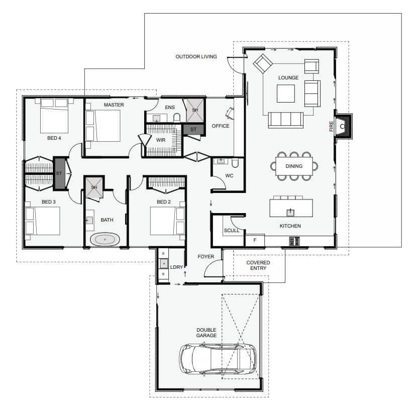 This home incorporates modern styling, strong brick forms and timber which help lift the roof-line. All this, paired with high glazing in the living, make this a home you cannot ignore. This design can be used in sections with driveways coming in from the east or west by simply flipping the garage, foyer and laundry if needed. Also if needed, an additional lounge can easily be added as an extra option. If you’re after a four or even five bedroom home with some urban style, this may just have your name on it!