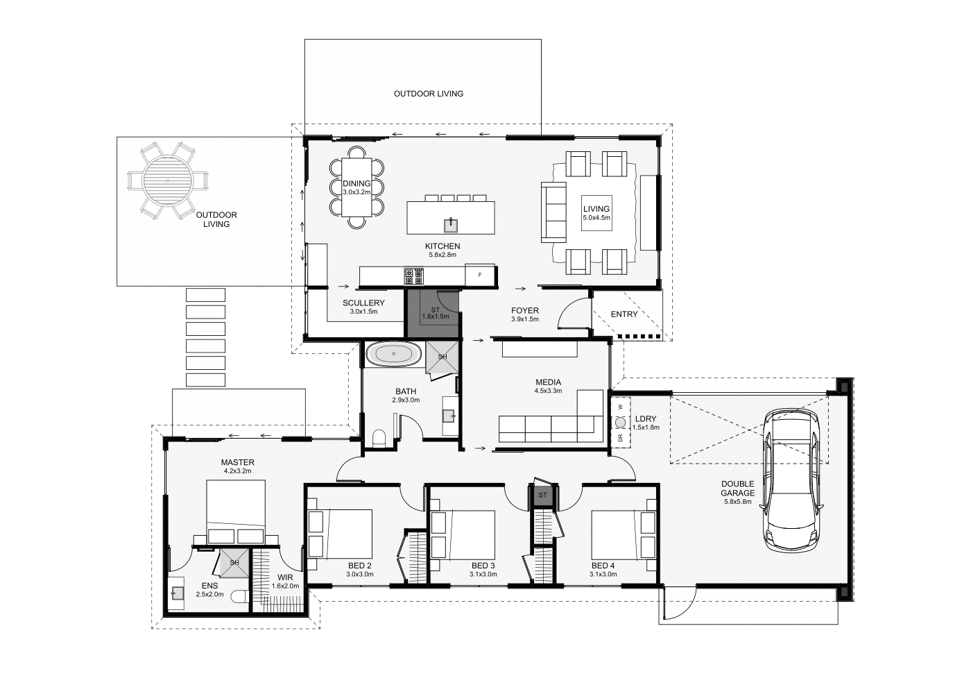 If a side access garage best suits you and your section, this four bedroom home does it well! Inside, there’s one good sized living and a separate media room directly off the foyer. The kitchen includes a scullery, there’s potential for an outdoor kitchen bar and pulling the roof over for a full covered outdoor living space!