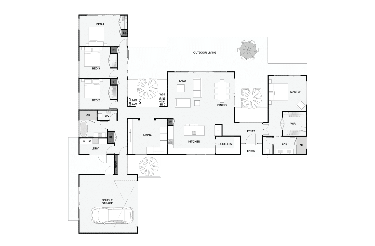 This three winged home will look stunning on a larger section and is perfect for the families who favour a master bedroom at one end and guest or children’s bedrooms at the other. The kitchen, spacious living and media rooms are positioned in the heart of the home and the outdoor living links everything together. With this home, you can be sure it will be loved for years to come!