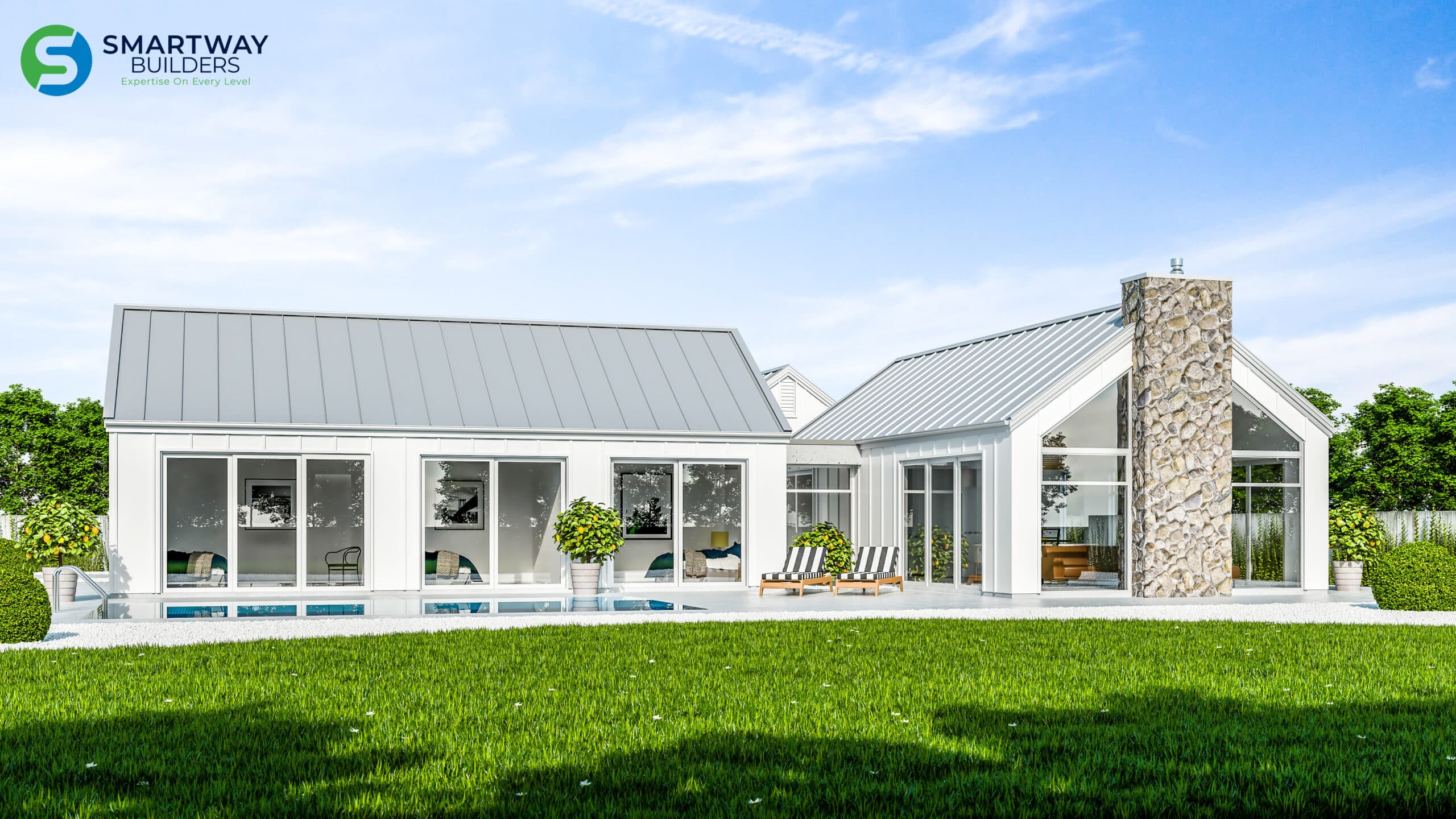 This modern farmhouse breaks the home into three clear pavilions, each housing a different part of the home; garage, living and bedrooms. This design can work whether your driveway comes in from the east, south or west. Some nice features of this home include the scullery, dual outdoor areas for all day sun, large walk-in wardrobe and ensuite plus a centrepiece chimney, which frames two large gable windows. This is a modern farmhouse, a timeless design, a fine structure you could just be lucky enough to call home!