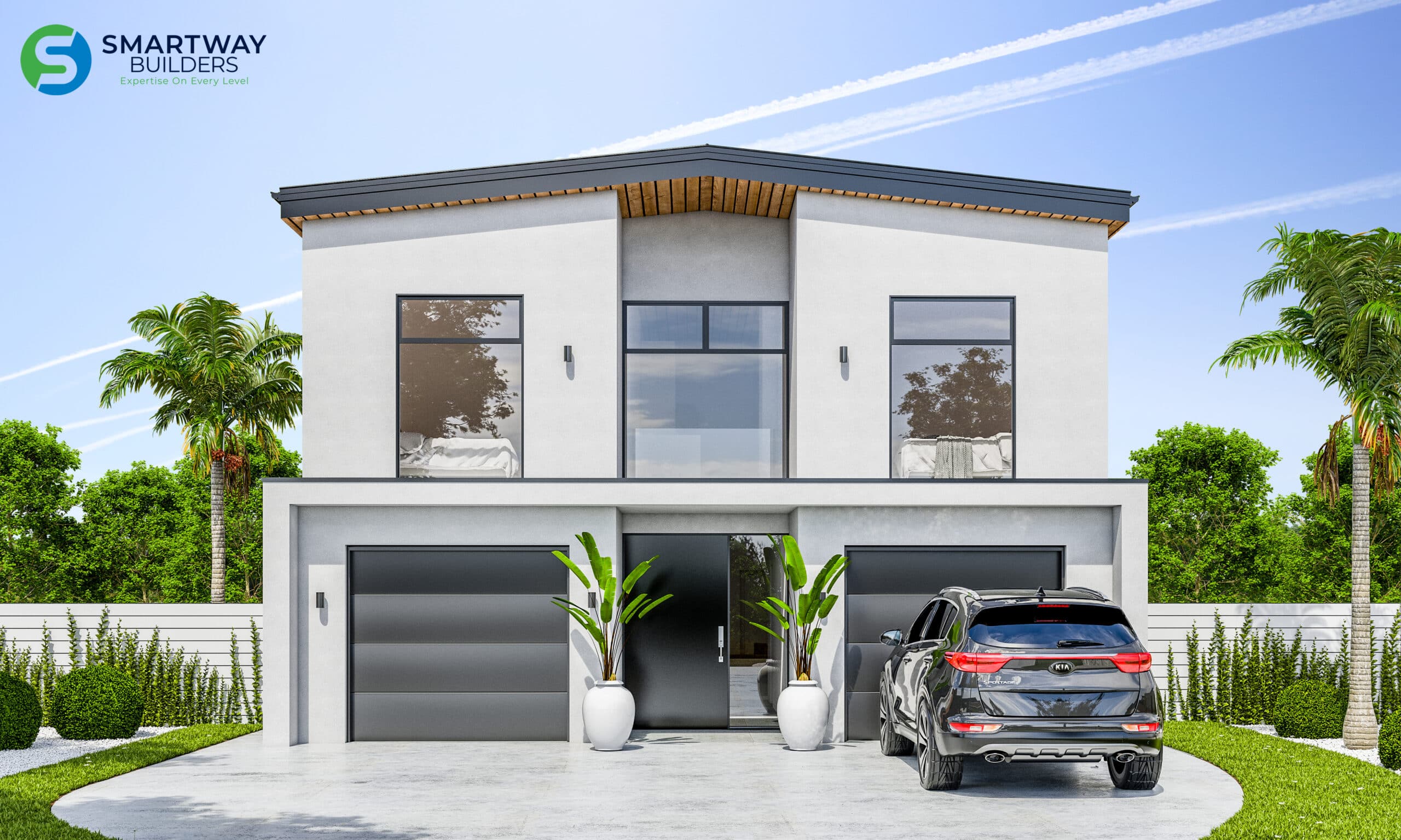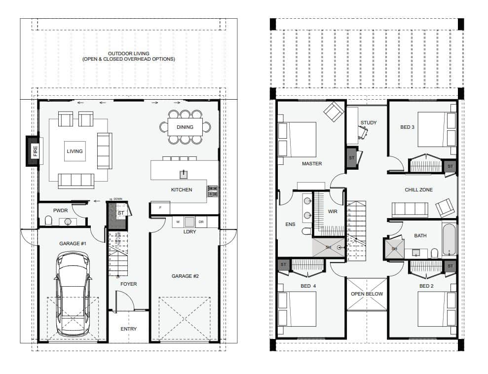 While this design derives from a basic rectangle shape, it's cleverly refined into a timeless architectural home. This is achieved by using an extruding band around the exterior, symmetry and some nice interior features. Together, this enhances the visual appeal and practical flow of the home. Some features of this home include the north-facing upstairs study, a chill zone, an atrium and the optional covered outdoor living space. If you like simplicity or symmetry, this is your home!