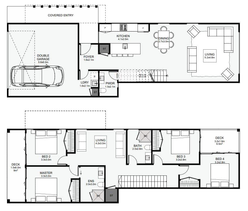 Here's a modern gable townhouse with clean lines, a double garage and a private entry. Unique to this layout is the private balcony access all four rooms enjoy, a bonus if your section has views! Inside there are four bedrooms upstairs, dual living, a guest toilet downstairs and a nook in the garage for the laundry. If double garaging is important to you in a townhouse, this is a great choice!