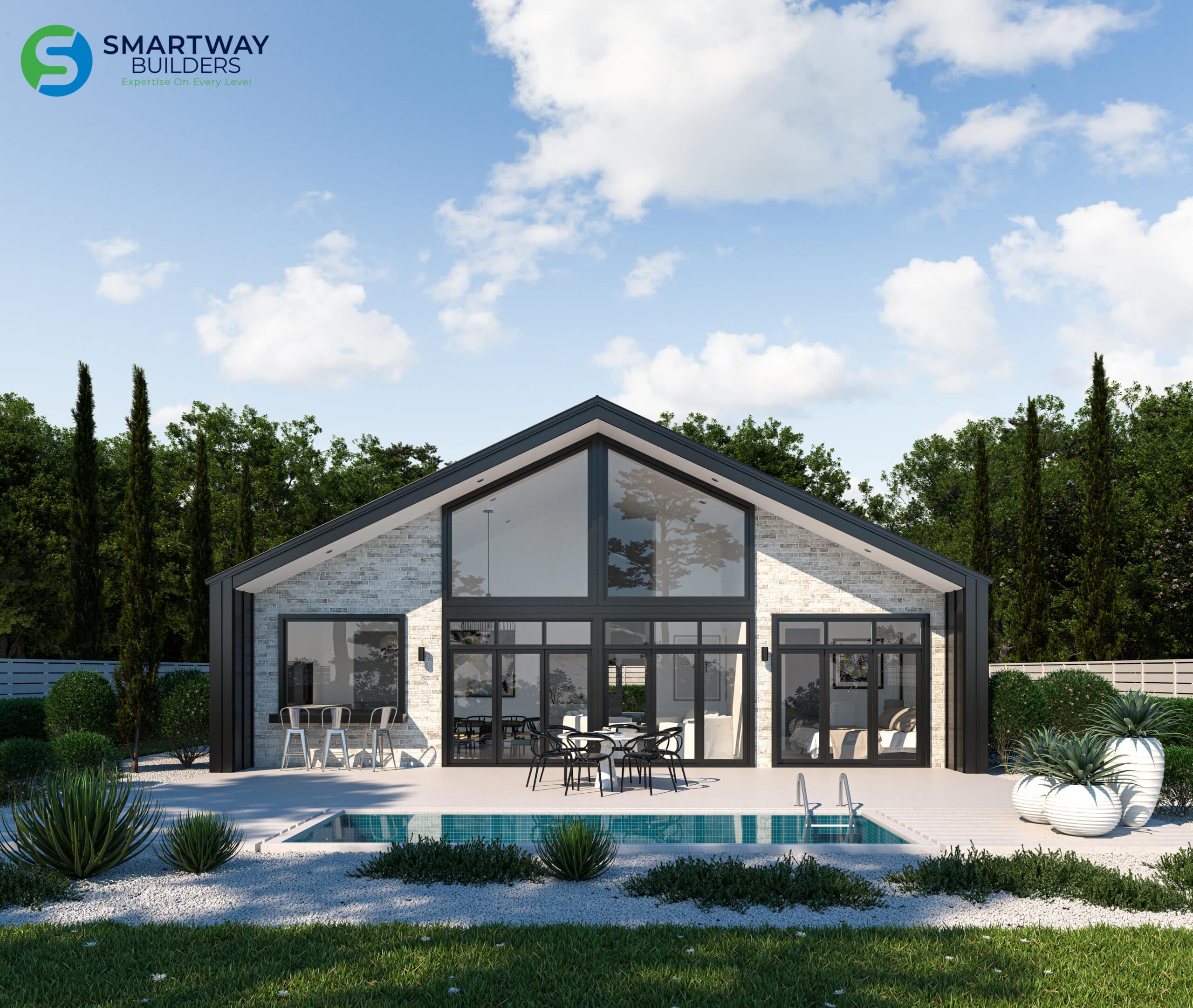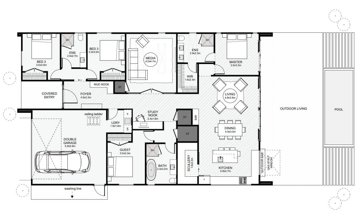 This modern home includes more than first meets the eye. Under one gable roof, four bedrooms are all positioned for multi-use; one as a guest room, the primary bedroom private with patio access, and two bedrooms with a jack and jill style bathroom. This home also includes a study nook, a media room with full-height glazed doors, lots of storage, a butlers pantry and a mud nook in the foyer. This is a family home ready for a lot of fun!