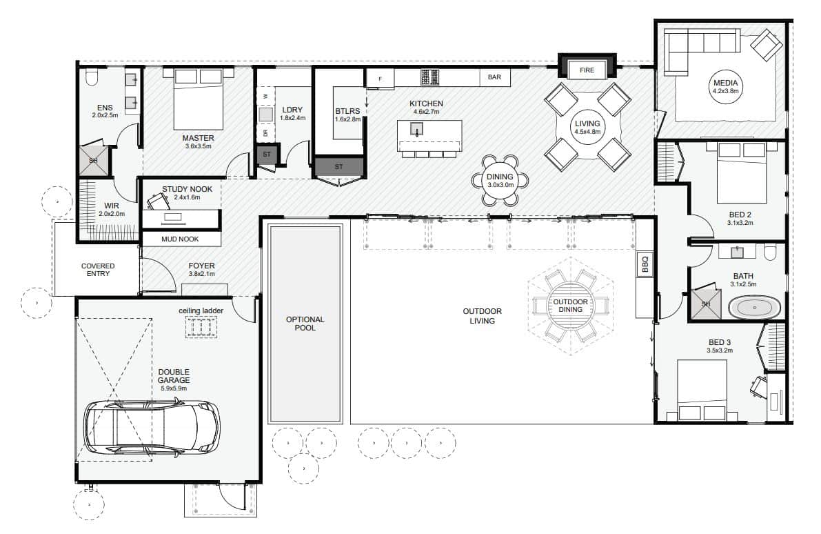 This ultra-modern 'U' shaped home is designed with a central outdoor living space protected from the wind. This layout also doubles to maximise property space on tighter lots. Inside, natural light fills the foyer from a large window framing the pool; there's also an in-built mud-nook, perfect for the kids. Other features of this home include its secret study nook, the large laundry, the butler's pantry, the separate bedroom wing and the media with its full height glazed door for light transfer. If you like protected outdoor living spaces and ultra-modern homes, this is a home you'll love.
